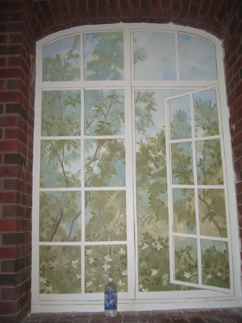 I painted this window mural in one day. Size 7.25 feet by 5 feet. Hardest part was to figure out proportions of the window sections, so it would relate to real window on the other wall. Also wall was not prepared, so I had to sand and put 2 coats of primer (second with poly). I was offered to do it the night before. I don't like to say No to challenge. I did it alone.