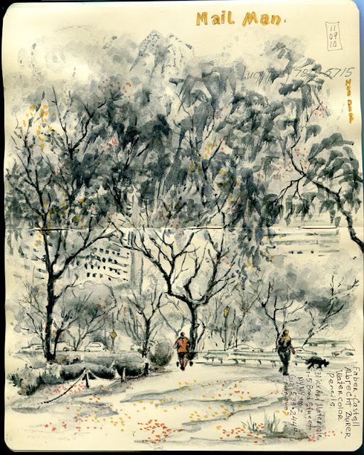My yard with beautiful trees, rows of benches, walking away mail man, who often brings me pencils from all over the globe. Yesterday I got vintage pencils from man from MO, who didn't take money, I was trying to buy one, he sent me 4. His name is Joe. Thank you very much, Joe. I drew with one of them, the oldest, you said, over 80 years old, the one with red end, so smooth. I love them. I will draw it. I used ink in Moleskine.